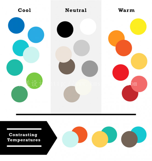 所有的顏色都是有溫度的,他可以被分為暖色(英: Warm)、冷色(英: Cool)或者中性色(英: Neutral)。紅色、橙色或者黃色會給人溫暖的感覺,而藍色、綠色則會給人冷的感覺,黑和白就給人中性的感覺(還有些不常見的米色和茶色,也歸屬這一類。),顏色就按這樣來進行劃分。利用顏色的溫度的不同來進行配色,例如暖色和冷色進行組合,可以給人一種巨大的反差。